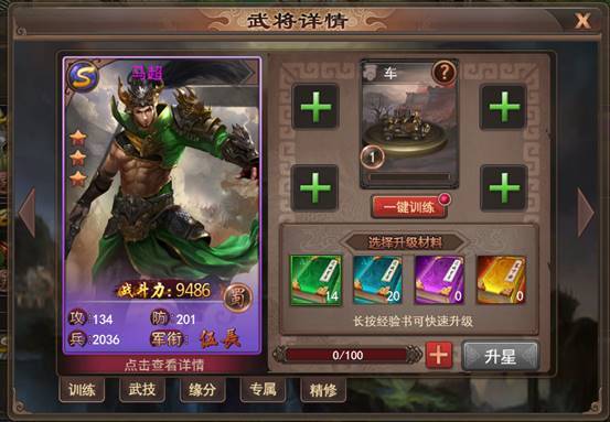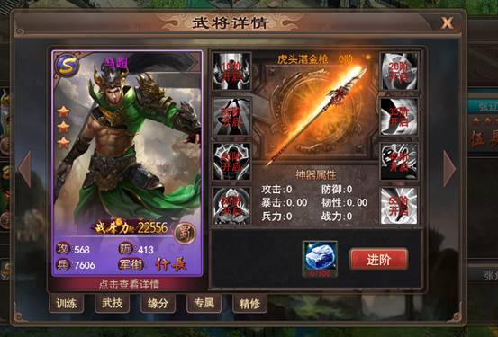 4. 消耗训练材料可以对武将进行训练,满足当前4项训练后还可以进阶武将,武将进阶后还可以开启新技能