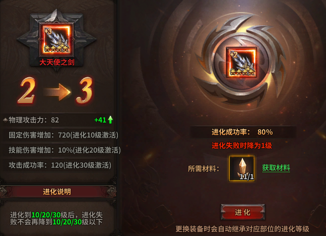 进化是有成功率的,失败会降低等级,进化达到10/20/30级之后,失败不会降到10/20/30以下。