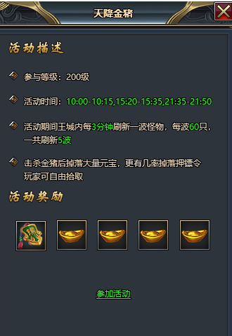 天降金猪 当玩家等级达到200级时可在天降金猪活动时间通过天降金猪NPC参与天降金猪活动。 活动时间为每天10:00-10:15、15:20-15:35、21:35-21:50