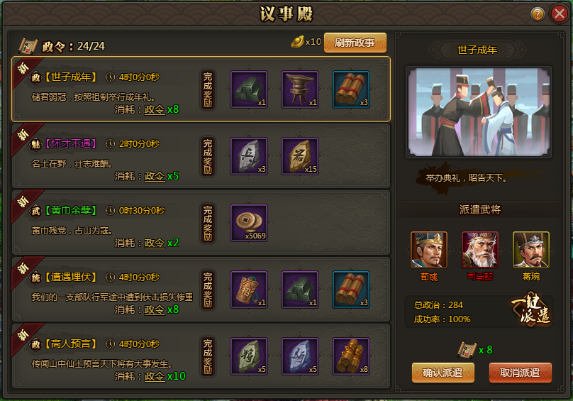 派遣武将完成政务,成功则可以获得相应奖励
