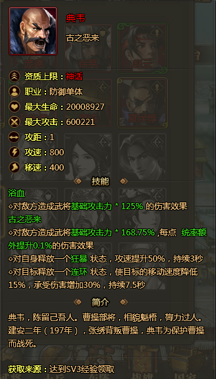 特玩游戏兵法三国典韦属性怎么样,兵法三国典韦资质怎么样,兵法三国典韦技能是什么,兵法三国典韦最高战力是多少,下面麻花为大家带来兵法三国典韦属性介绍。