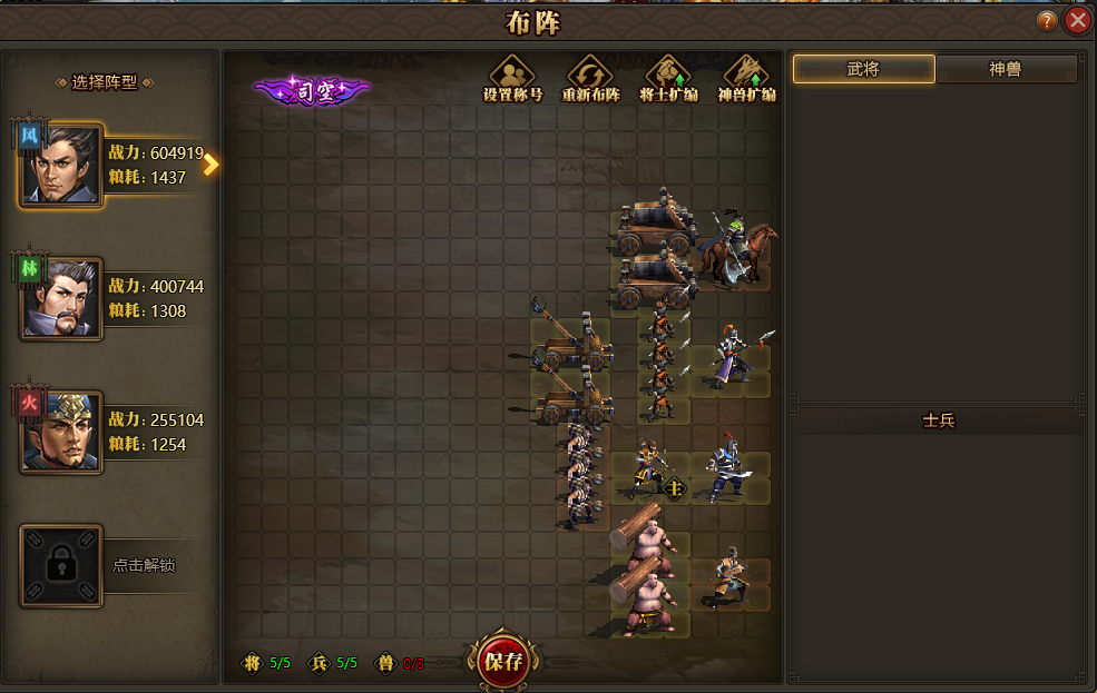 在布阵中你可以布置在世界地图中战斗的各个阵型,拖拽右侧列表中的武将士兵到左侧布阵区域即可完成上阵,拖拽左侧布阵区域中的武将士兵到其他区域即可完成下阵,点击“重新布阵”可以快速将当前阵型所有武将士兵下阵。你可以根据上阵武将和士兵计算战力和消耗的粮草,从而在太学升级排兵布阵可以布置更多的阵型。