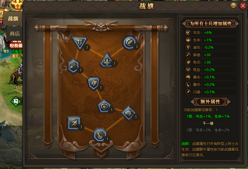 游戏中战旗一共有5个等级,等级越高,属性加成越好。玩家可拖拽战旗来进行配置,且战旗只能放入对应颜色的格子中,大家可以为各个阵型编辑不同的战旗页。战旗可通过战旗碎片来兑换,碎片的获取来源包括商城、每日必做、霸王复仇,分解战旗也可以获得战旗碎片,玩家可以选择相应等级的战旗进行批量分解。