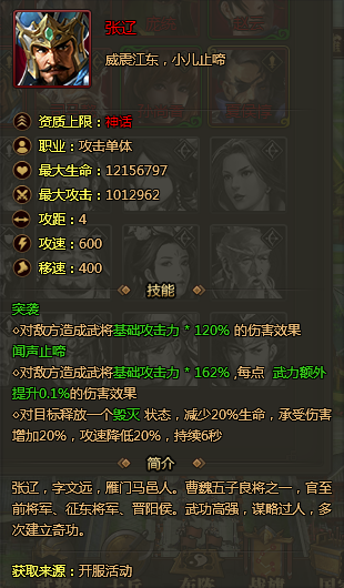 兵法三国武将张辽属性怎么样,兵法三国张辽资质怎么样,兵法三国张辽技能是什么,兵法三国张辽最高战力是多少,下面为大家带来网页游戏兵法三国张辽属性介绍。