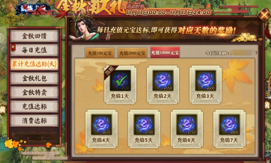 l 活动期间,每日累计充值达标即可领取对应奖励。具体对应档次奖励情况: