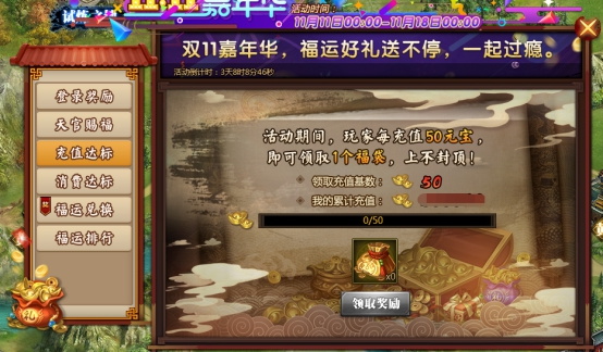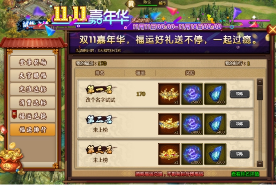 l 活动期间累积福运进行排行,可获得专属称号及丰富道具奖励福运越多,排名越高,截止11月18日0:00后可领取奖励;