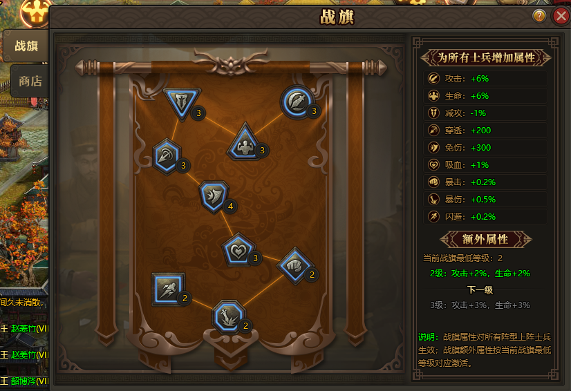 战旗中所获得的能力提升将为所有士兵增加属性,每种能力均可进行升级,升级后士兵所获得的属性也将相应加强。当九种能力同时达到某一等级时,将激活额外属性,共同等级越高,能获得的额外属性也越多。