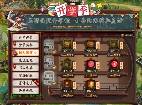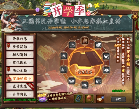 l 活动期间每充值50元宝,即可领取一个书山礼包(随机),上不封顶。书山礼包(随机):随机开出开(概率25%)、学(概率25%)、那(概率25%)、点(概率17%)、事(概率8%)其中1字。