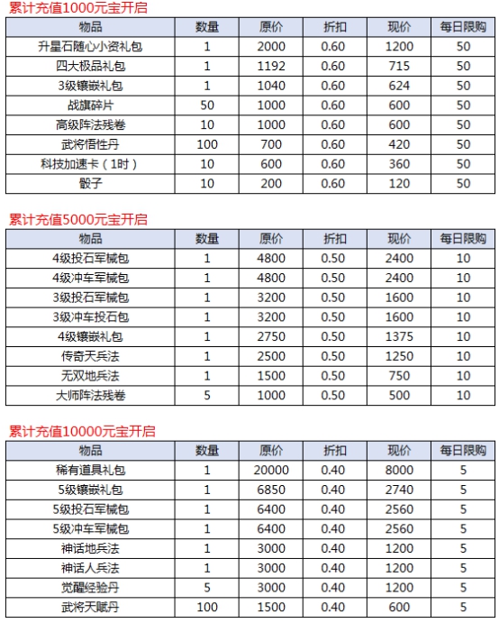 l 每日累计充值达到指定元宝可开启对应商店,充值金额越高,折扣越低;