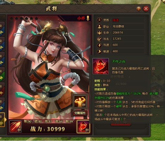 l 新增武将—小乔:同类攻击距离+1,怒气技能可复活已死亡最高战力的武将(每场最多复活一个),详情如下: