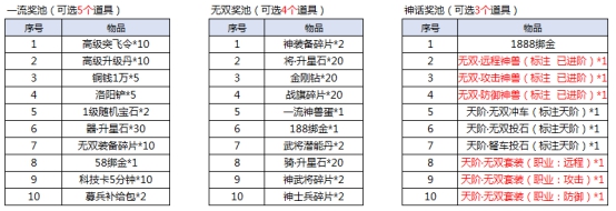 l 奖池分为一流、无双、神话3种 ,玩家每天可在3种奖池中选取分别选取5(一流)、4(无双)、3(神话)个道具来组成奖励转盘进行抽奖,每天仅一次自选次数,奖池情况如下: