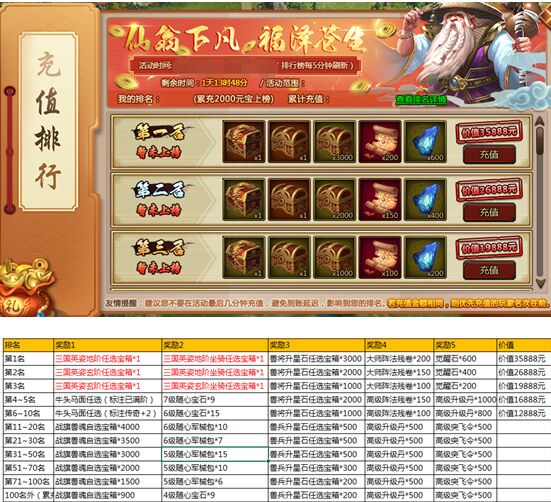 建议不要再最后几分钟充值,避免出现延迟影响排名,活动结束后,排行榜上玩家依据排名领取对应礼包。