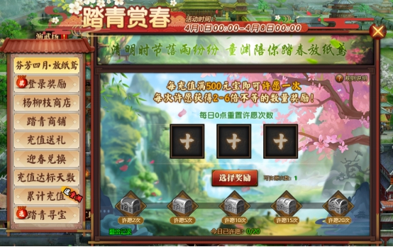 l 活动期间每充值50元宝,即可领取一个纸鸢(随机),上不封顶。纸鸢(随机):随机开出暖(概率25%)、春(概率25%)、踏(概率25%)、青(概率17%)、游(概率8%)其中1字纸鸢。