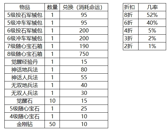 l 活动期间,可使用命运进行道具兑换,兑换时有10%几率触发随机折扣;