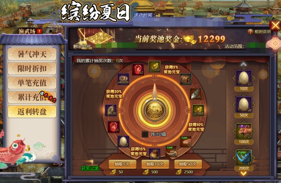 l 抽奖1次消耗50元宝,10次消耗500元宝,50次消耗2500元宝。每次抽奖消耗元宝的20%注入奖池,奖池初始元宝10000。