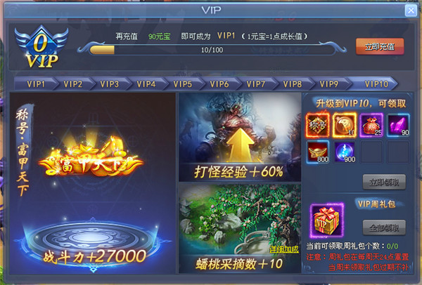 2、在提升至相应的VIP等级后,玩家们可以领取到丰厚的VIP礼包,同时还可以每周领取周礼包,不同等级的VIP同样也享有不同的VIP特权