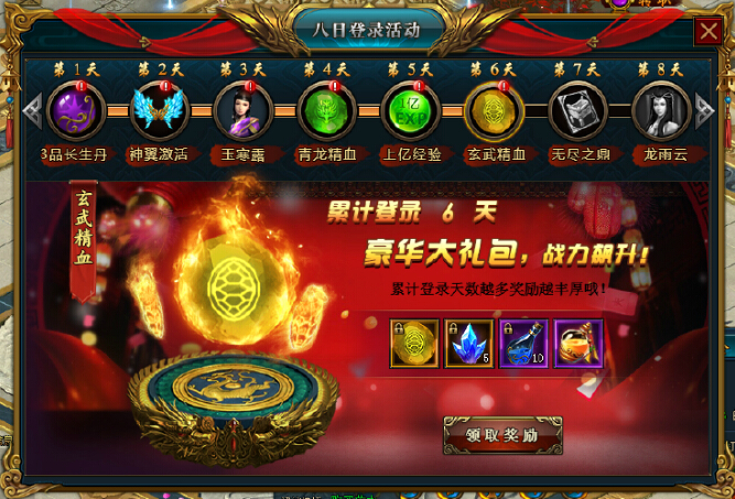 2、 请在开服第8天领取所有奖励,8日过后,奖励将不能领取。