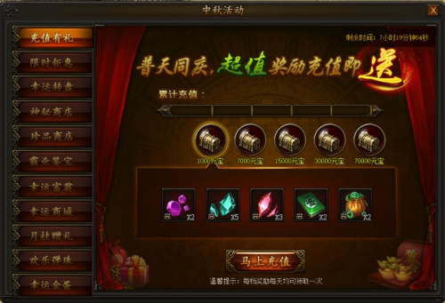 活动期间,充值元宝即可领取五档丰厚奖励,每天均可领取一次,不容错过!