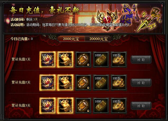 【活动内容】活动期间,每天只要充值达到2000元宝,即可领取荣耀盛典超值礼包!
