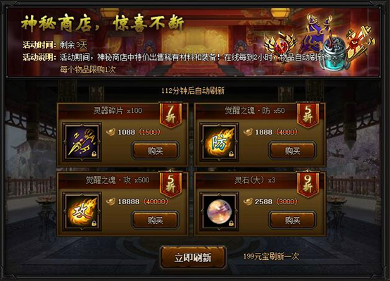 【活动内容】活动期间,神秘商店限时开启,稀有材料超低价格出售,不容错过!每过2小时,商店物品自动刷新,消耗199元宝可立即刷新,每个物品限购一次。