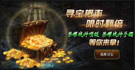 【活动内容】活动期间,战神宝藏寻宝概率限时翻倍,荣耀战神项链、荣耀战神手镯等你来拿!