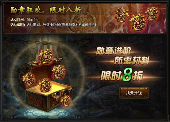 【活动内容】活动期间,升级神炉中的勋章所需材料限时八折优惠!