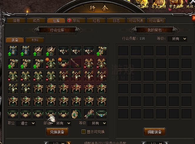 到行会仓库兑换装备是玩家获得高阶装备的重要途径。不妨多捐献装备以及钱财到行会哟!