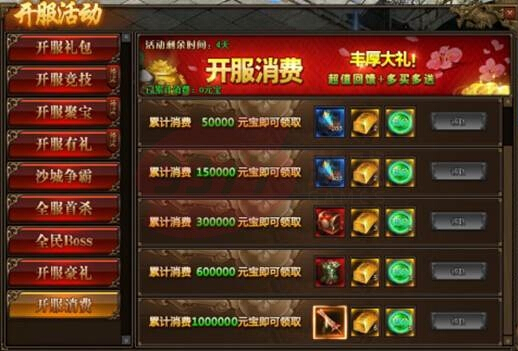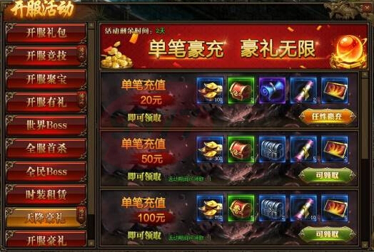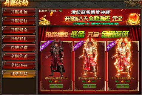 活动详情:活动期间玩家只需花费对应数量的元宝,即可获得极品精美套装。套装包含主角神装、光翼礼包、灵兽礼包、神器礼包。珍奇好礼,让您体验非一般的游戏感受!