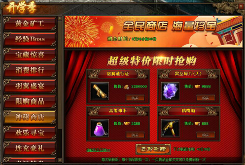1.活动期间,玩家可在神秘商店中购买商品,商品可用金币,绑元,元宝进行购买;