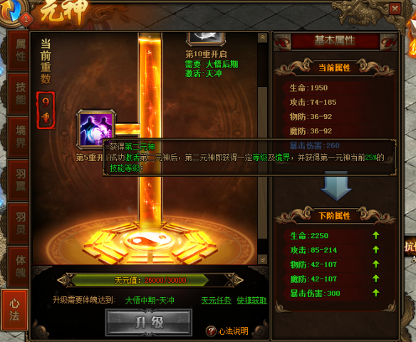 前提条件:第一元神将新增天元心法功能,第一元神体魄等级达到飞升初期,即可激活天元心法,激活之后,天元心法每隔四重会达到一个关键重,突破第一个关键重,即第五重,就可以激活第二元神了。突破剩余的每个关键重,都会为第二元神的属性带来质的飞跃。