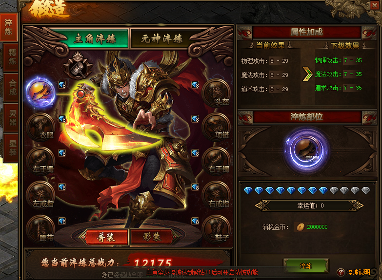 淬炼一共分为蓝钻淬炼、紫钻淬炼、黄钻淬炼三个档次,每个档次分别有12级淬炼等级。现在就来说说不同钻石的区别。红钻淬炼在消耗金币的基础上还要消耗淬炼石,且同样有幸运值系统。