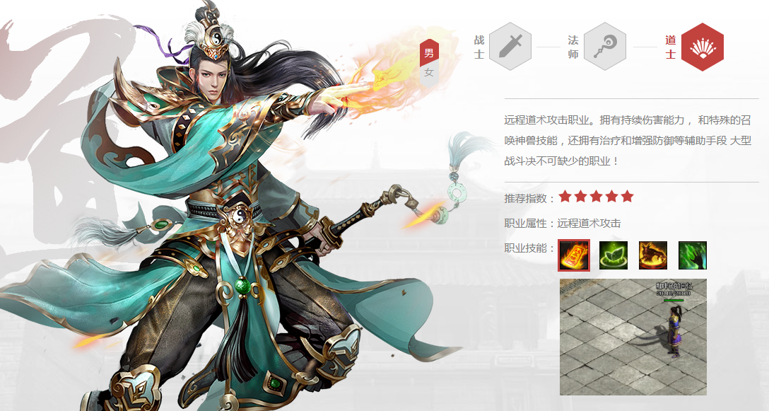 其次就是道士,前中期很强力的职业。因为道士的技能非常的全面,有爆发、有毒、有加血还有隐身。在前期不管是刷怪还是PK都是非常强力的。道士的毒术是非常强力的一个技能,其破防加上每秒掉血,简直就是打BOSS的神技。同时道士还有各种强力的辅助技能,使得有经验的玩家打BOSS做活动,都会组上一个道士可以大大提升整个团队的效率。而且技能的强力让道士不需要太好的装备就可以有不俗的表现,所以这种职业非常适合平民玩家以及小人民币玩家,不需要投资太多钱,只要玩的路子对了,一样可以很厉害。