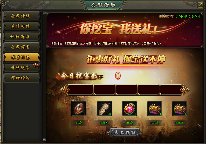 活动说明:活动期间,每日在龙之宝藏中挖宝次数达到指定次数(次数每天重置)