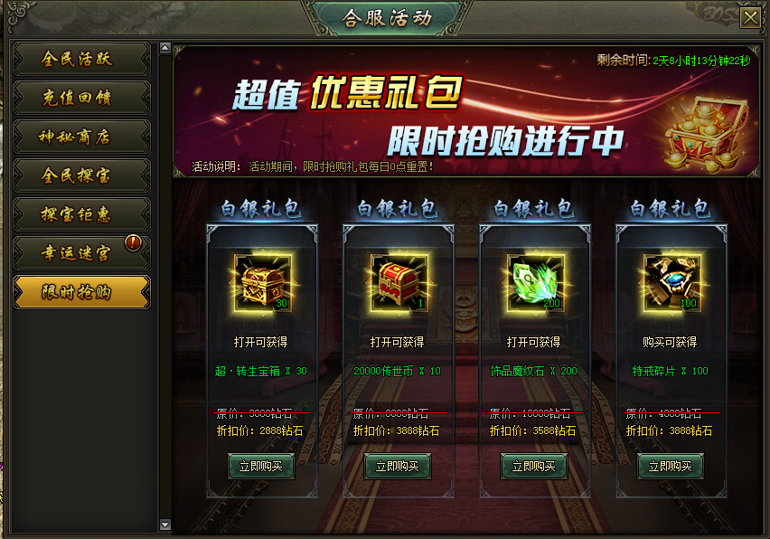 活动说明:活动期间,推出特价商品,每隔两小时自动刷新一次,玩家可使用钻石进行手动刷新