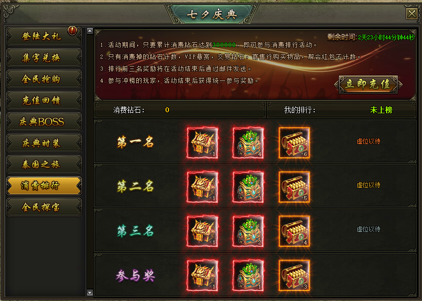 活动说明:活动期间,消费达到300000钻石的玩家参与排行,排名前三的玩家可获得高阶武器箱、魂级生肖宝箱等奖励,奖励在活动结束后以邮件的方式进行发放