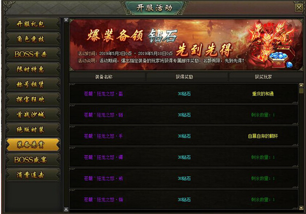 活动内容:活动期间,通过击杀BOSS首次掉落指定装备的玩家,可以获得丰厚的钻石奖励!