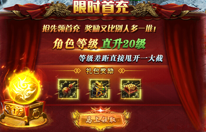 网页游戏创世中,玩家抢先领取首冲,奖励又比别人多一堆!新服开启前30分钟首次手指杰克领取限时首冲奖励。