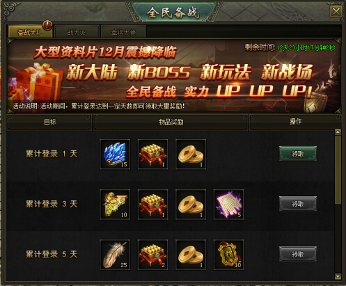 (1)备战大礼:活动期间,累计登陆达到指定天数,即可免费领取大量奖励