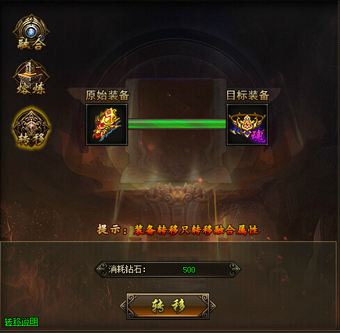 1.已融合的装备可转移到另一件未融合的装备上