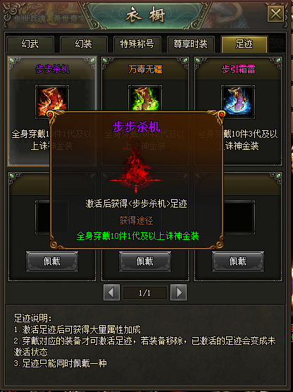 1)步步杀机:全身穿戴10件1代及以上诛神金装激活