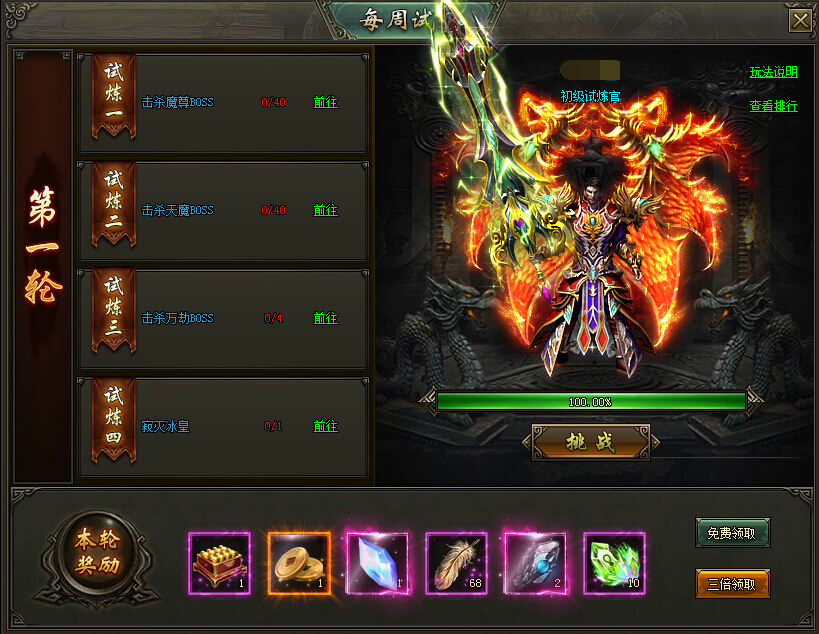 (5)战胜当轮试炼官后,可领取当轮奖励,奖励可免费或三倍领取
