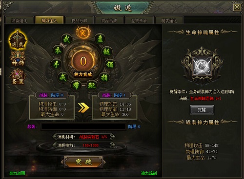 装备槽全部注入后,玩家需要消耗对应的突破石进行突破,才可以进行下阶的注入,突破石可以通过神力炼制获得。