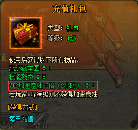 第二种是需要玩家通过进行每日充值获取到vip加速卷轴-3倍(2小时),每天玩家通过充值可以获得4个,杀一只boss相当于杀了3只,vip成长速度+2。