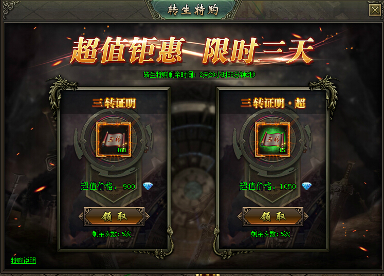 到达3转后,还是第一时间挑战转生神殿,3倍领取奖励,之后玩家购买转生特惠中的转生证明,转生证明·超购买3-4次,其余的购买转生证明补齐即可升到4转。大约需要花费4000钻左右。