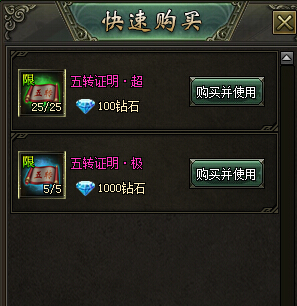 到达5转后基本是第一天的极限了,玩家可以挑战玩转生神殿后,手中并且有充足的钻石,可以选择购买剩下的转生证明(土豪玩家的选择)。