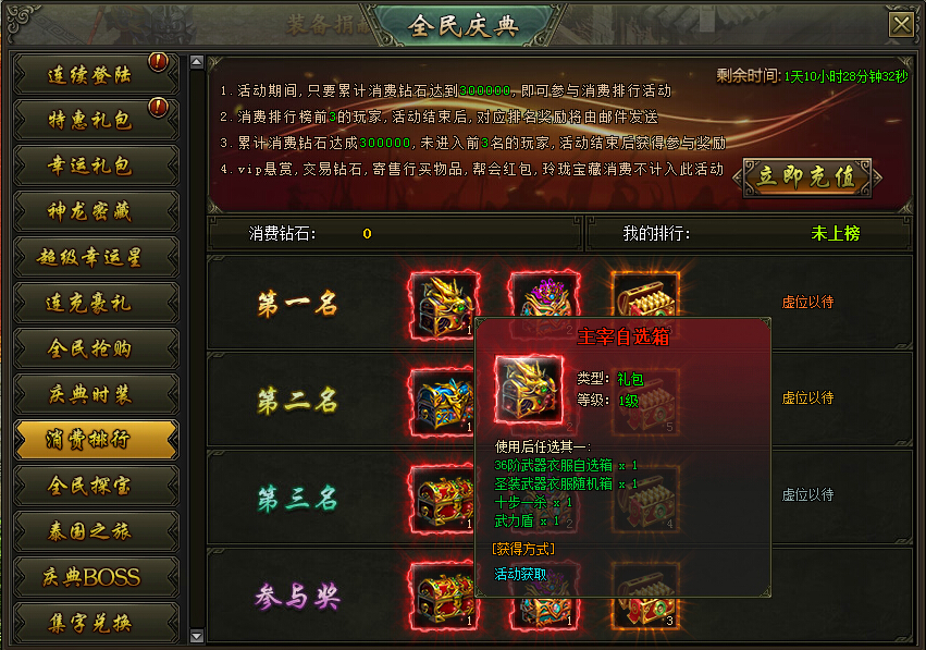 创世高级武器的话一般可以通过刷boss、抽奖和活动获得,创世中的全民庆典活动中消费排行奖励有高级武器赠送,那么如何可以用最低的钻石参与活动呢?