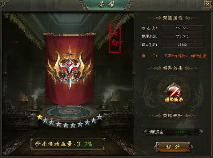 荣耀的升级最重要的是升级斩杀技能,小编预计的话升到满级应该可以描述怪物10%的最大血量,当日这个是有几率触发的,玩家可以购买斩杀特惠礼包,可以激活超级斩杀,提高斩杀50%触发几率。注:假如原来触发几率是2%,购买激活超级斩杀后是3%,不是触发概率提升50%。