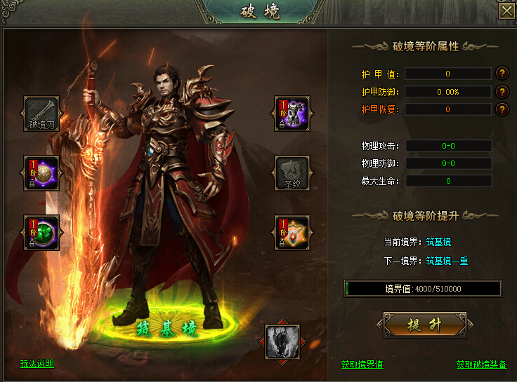 3.破境技能:穿戴6件极品以上破境装备激活破镜技能“破天怒斩”。