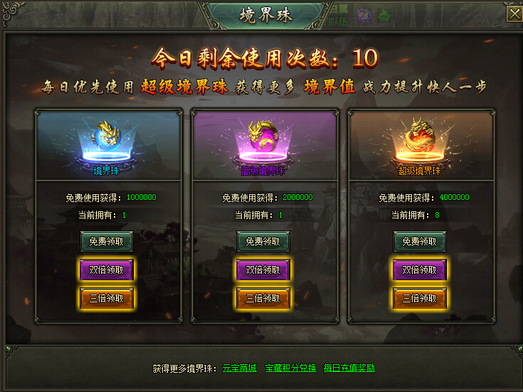 境界珠:免费来领取10w境界值,双倍领取消耗100钻石,三倍领取消耗200钻石。可以通过元宝商城花费15w元宝购买。