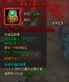 神饰本源大礼包:开启后获得神饰结晶*200、神饰本源*100,原价:74000钻石,现价:36888钻石。